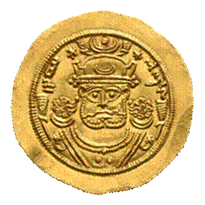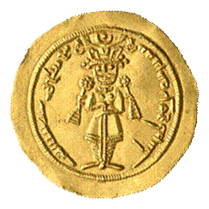 О.с.: Хосров с короной на голове стоит в фас, опирается на меч. Золото. Вес: 4,21 г. Диаметр: 26 мм. Göbl VI/7; Sunrise 989; Paruck 460.
